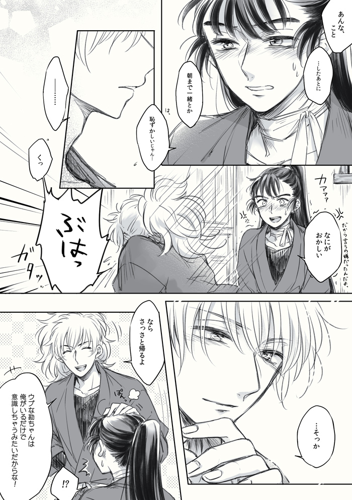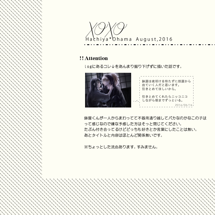 冒頭のシーンは事後なんですけど…鉢屋くんは勘ちゃんに引きとめてほしくて身支度を手伝わせるんですが、自分が意地張ってるだけとはいえこのまま別れるのは惜しいので邪魔したりする。あと“身勝手”を怒ってもほしいんです。勘ちゃんが自分に対してありのままの感情をぶつけるところが見たい。