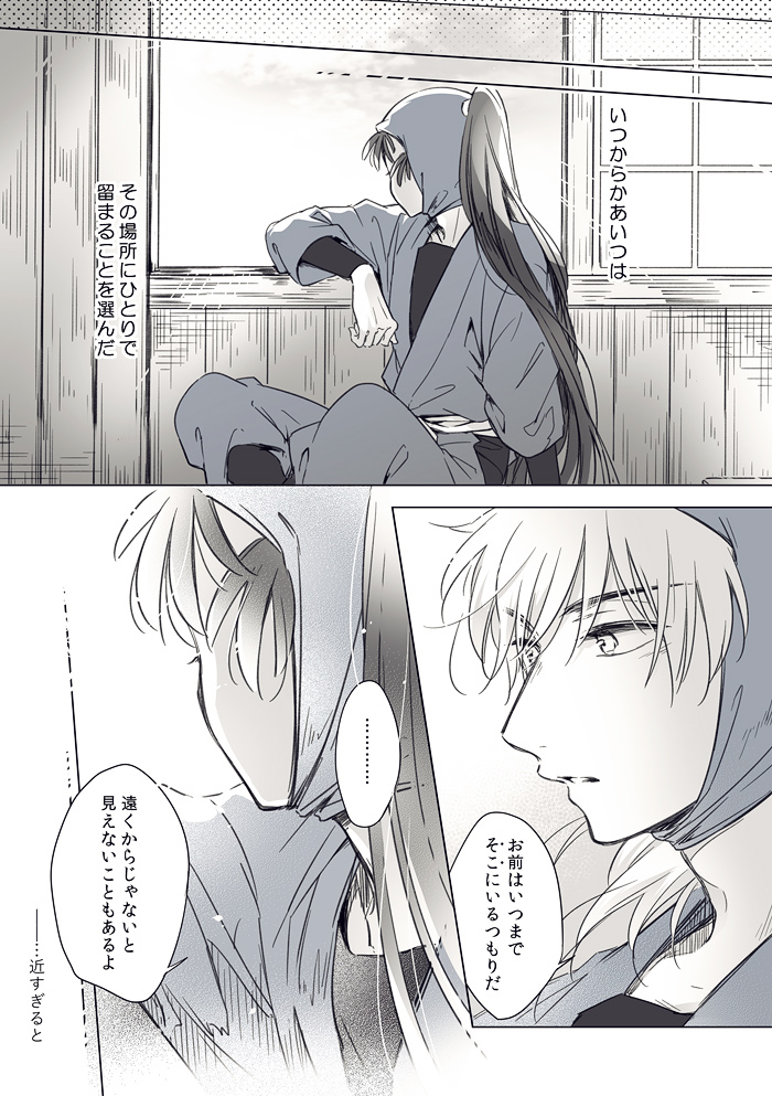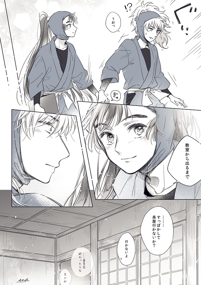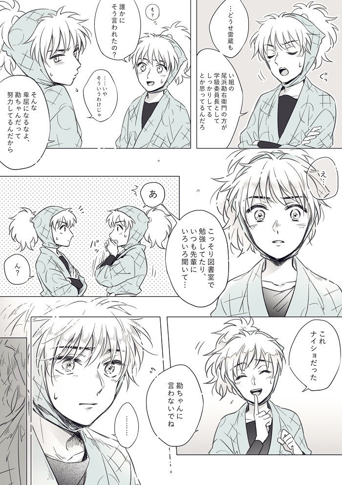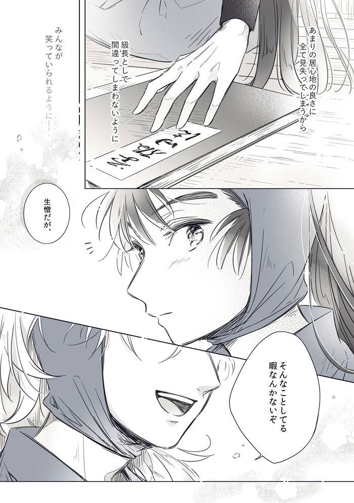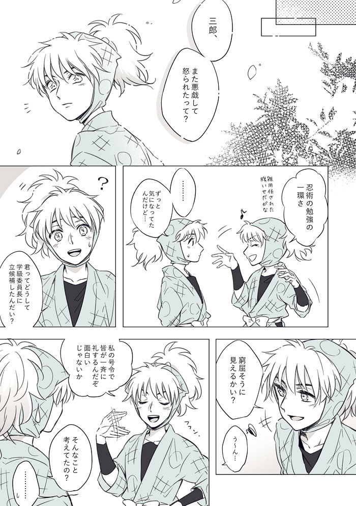 9頁のゴシック体で書いてるモノローグは過去(五年時)に勘ちゃんが鉢屋くんにこぼした言葉を鉢屋くんが回想してるんですが……こういうの説明無しでも伝わるように上手く書けるようになりたい。